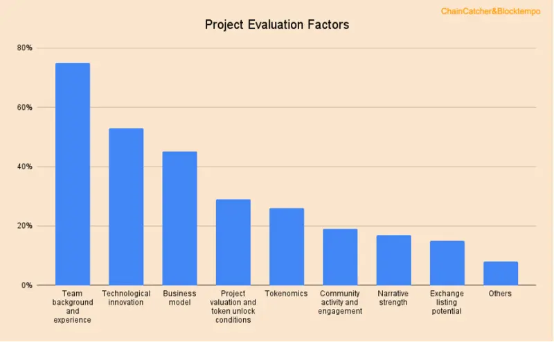 Team background and experience (75%), technological innovation (53%), and business model (45%) are the three most valued factors for investors in evaluating projects.