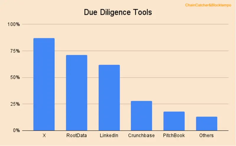 X platform (87%), RootData (71%), and LinkedIn (62%) are the most commonly used due diligence tools.