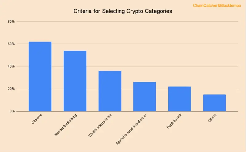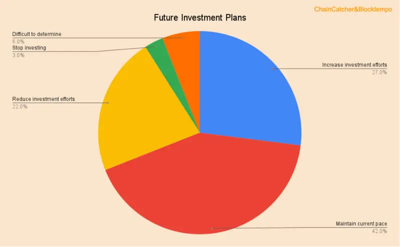 42% of investors plan to maintain their current investment pace over the next 4 months, 27% plan to increase investments, 22% plan to decrease investments, and the remaining few investors (9%) are cautious or uncertain about market prospects, choosing to either find it difficult to judge or stop investing. It’s worth noting that only 31% of investors explicitly express caution or reduced investment attitudes, while more early-stage investors still express optimism, which may drive a cyclical recovery and prosperity in the Crypto primary market in Q4.