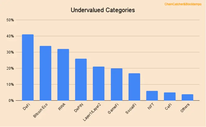 DeFi (41%), Bitcoin ecosystem (34%), and RWA (32%) are considered the most undervalued categories.