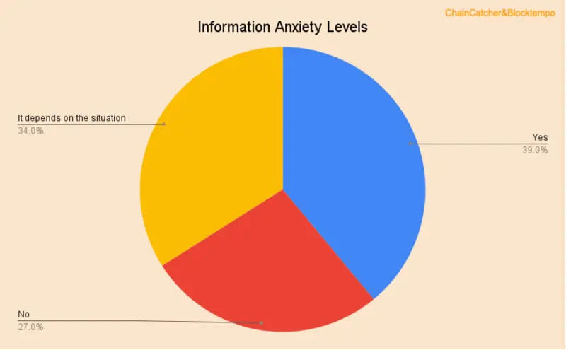 39% of investors report significant information anxiety, 34% say their level of information anxiety varies depending on the situation, and 27% report no significant information anxiety. Nearly 40% of investors experiencing significant information anxiety also indicates that the Crypto market is still in a period of rapid development, with many unrefuted innovations still existing in the market.