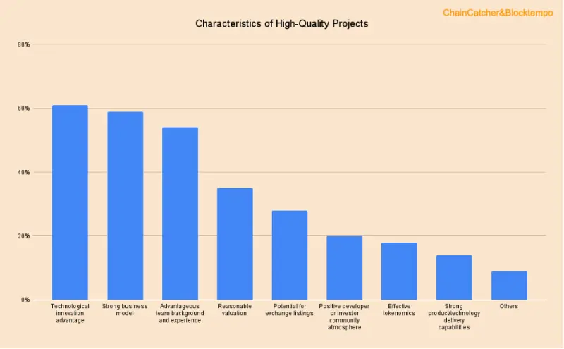 Technological innovation (61%), business model advantages (59%), and team background (54%) are key characteristics of quality projects.