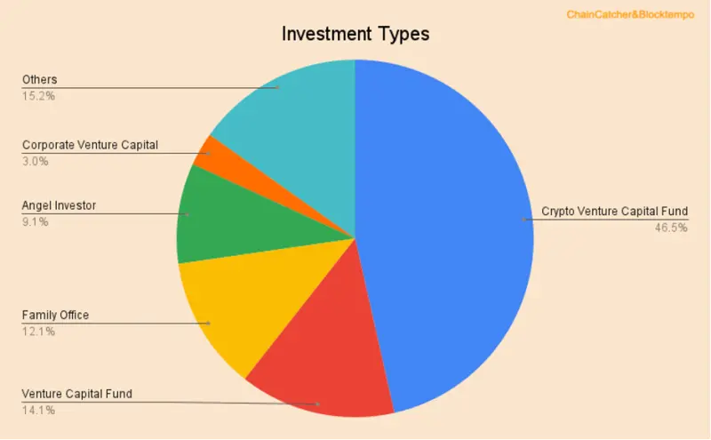 46% of respondents are from Crypto Venture Capital Funds, 14% from traditional Venture Capital Funds, 12% from Family Offices, 9% from Angel Investors, 3% from Corporate Venture Capital, and 15% from other types.