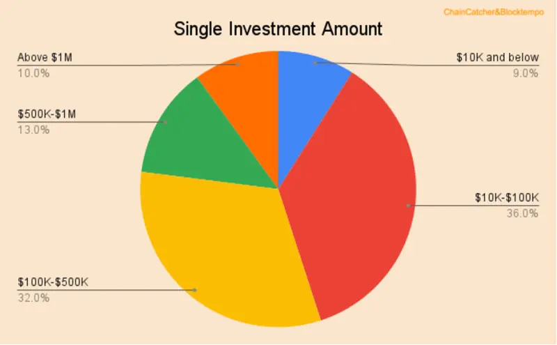 36% of investors make single investments in the $10K-100K range, 32% in the $100K-500K range, 13% in the $500K-1M range, 10% above $1M, and 9% below $10K.