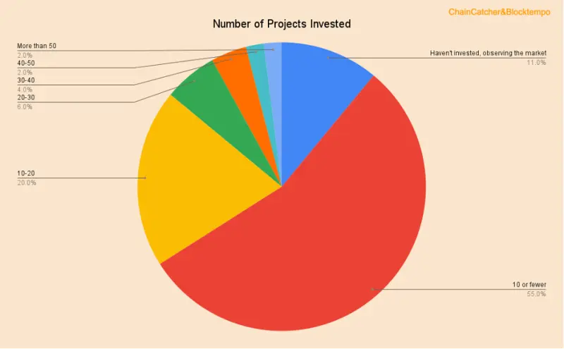 55% of investors invested in 10 or fewer projects this year, 20% invested in 10-20 projects, 11% are observing without investing, 6% invested in 20-30 projects, 4% in 30-40 projects, 2% in 40-50 projects, and 2% in more than 50 projects.