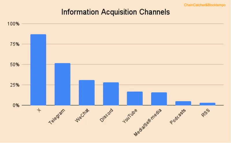 X (formerly Twitter) is the most popular information channel, chosen by 87% of respondents. This is followed by Telegram (52%), WeChat (31%), Discord (28%), YouTube (17%), media/self-media (16%), podcasts (5%), and RSS (3%).