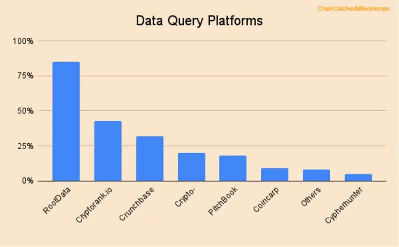 The survey shows that RootData is the most popular investment data query platform with an 85% usage rate, followed by Cryptorank.io (43%) and Crunchbase (32%).