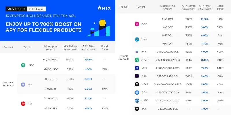 Beyond its success in asset listings, HTX has dedicated greater efforts to advancing its other business lines. Recently, HTX upgraded its Flexible products on HTX Earn, offering limited-time interest rate boosts on 13 major crypto assets as a way to thank users for their support. After the interest rate increase, HTX Earn’s Flexible products now offer industry-leading APYs, including two major stablecoins, USDT and USDC, as well as 11 popular PoS coins like ETH and TRX.
