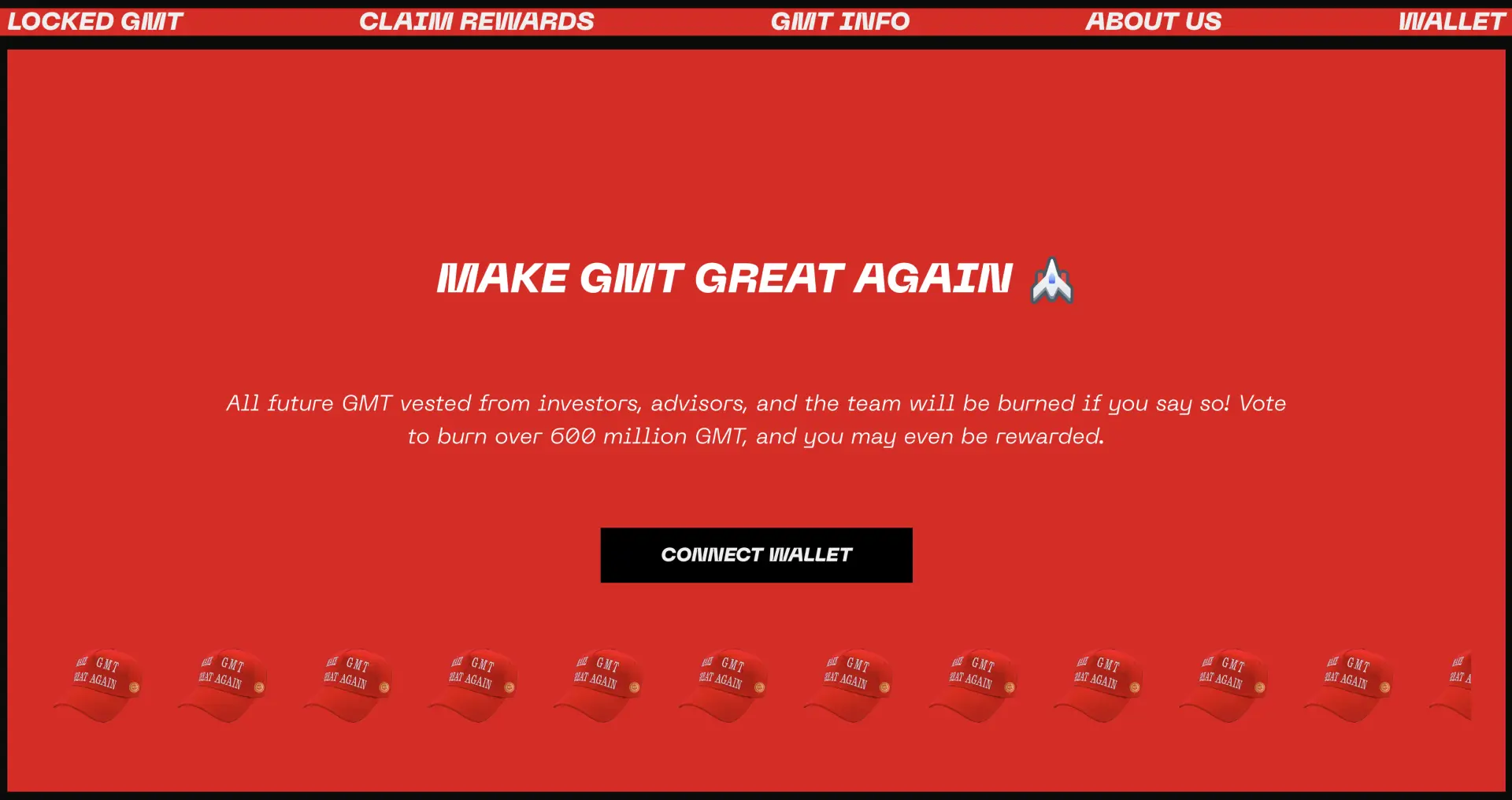 - Lock and Vote: GMT holders can participate by visiting burngmt.com, where they can lock their tokens and cast their vote on various proposals, including the first of its kind “GMT Burn Initiative”. Participants will receive an exclusive soulbound ‘Make GMT Great Again’ Red Hat NFT as a token of acknowledgement for their involvement. This NFT will record metadata detailing the claimed and eligible airdrops, as well as the votes cast.