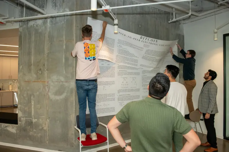 The team printed Bitcoin whitepaper as a decorative feature on the main wall of the new office, symbolizing the foundation of blockchain innovation.