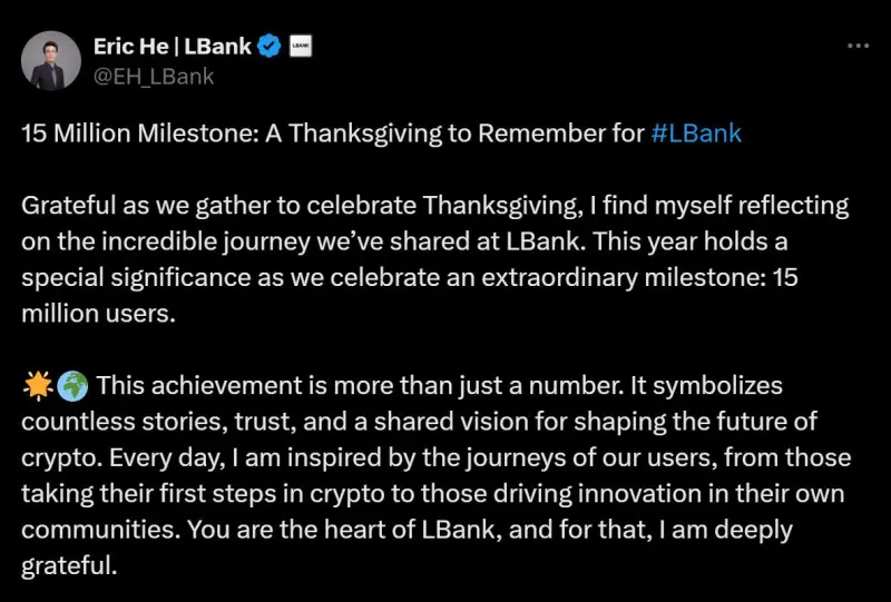 On November 28, 2024, during the festive spirit of Thanksgiving, Eric He, LBank’s community angel officer and risk control adviser, announced on social media that LBank has officially reached 15 million registered users, and shared the gratitude for users’ support.