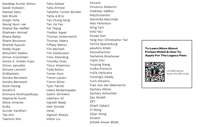 In a celebration of innovation, Forbes Web3 proudly showcases the community members who hold the Forbes Legacy Pass in its December 2024/January 2025 issue. The Forbes Legacy Pass is more than a membership- it’s a transformative experience bringing together a cohort of global entrepreneurs, founders, and creators. It grants members exclusive access to global Forbes Web3 events, access to curated artist drops, and a global community of thinkers and doers. To learn more about the Forbes Legacy Pass and to apply for a spot, users can visit Forbes Legacy Pass.