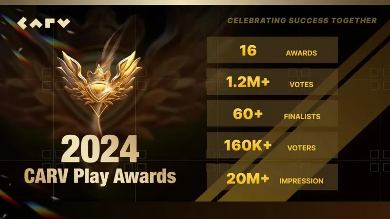 The CARV Play Awards 2024 recognizes the achievements in gaming across 16 categories, highlighting both established and emerging talents. As part of CARV’s mission to empower the future of gaming, the awards aim to unite the global gaming community and spotlight the projects shaping the industry’s future. This year’s record-breaking engagement underscores the awards’ significance as a platform for gamer participation and industry recognition.