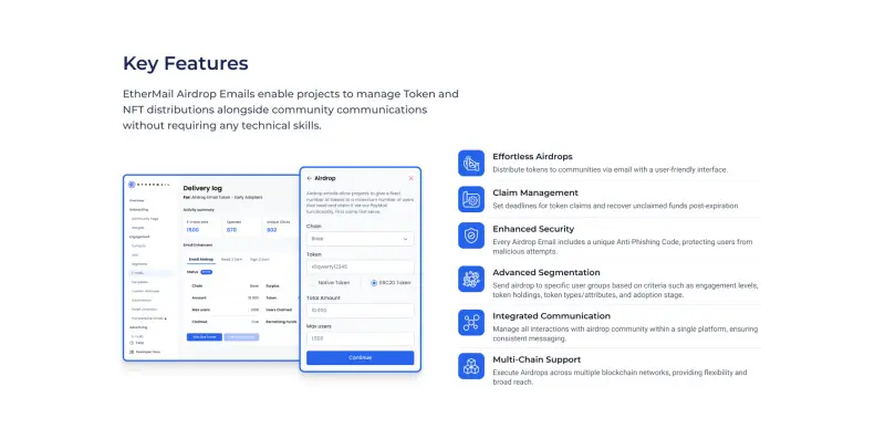 While traditional token and NFT distribution methods often require specialized knowledge, EtherMail’s Email Airdrops empower organizations to manage distribution and engagement in one unified platform, and across multiple blockchain networks – saving time and resources while boosting community participation. It reduces the need for multiple tools and cuts operational costs while giving web3 projects complete control over their airdrop campaigns from initiation to completion.