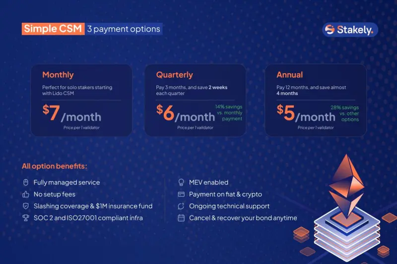 Unlike traditional staking solutions, Simple CSM removes the need for complex server management. Users can provide the required bond (2.4 ETH for the first validator, 1.3 ETH for subsequent ones) and subscribe to a flexible plan—starting at just $5 per month—payable in fiat or cryptocurrency.