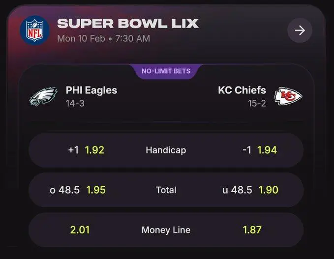 Early market activity, observed by Cloudbet’s Trading Risk and Operations team also indicates a fairly even split on both sides – 55.81% of the money is coming in on the Chiefs, with 44.19% for the Eagles. There’s also been a particular interest in the “under”, suggesting bettors anticipate a tighter, more defensive game than in Super Bowl 57 where the two teams last faced off. The Eagles enter as slight underdogs despite a dominant postseason performance by Saquon Barkley.