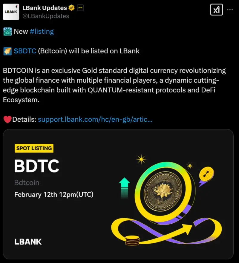 BDTCOIN ($BDTC), the revolutionary gold-standard digital currency, is proud to announce its official listing on LBank Exchange, one of the world’s leading cryptocurrency platforms. This milestone marks a significant step forward in BDTCOIN’s mission to redefine global finance by merging the stability of gold with the innovation of blockchain technology. Trading for BDTC will begin on February 12, 2025, at 12:00 UTC, in the Innovation Zone under the BDTC/USDT trading pair.