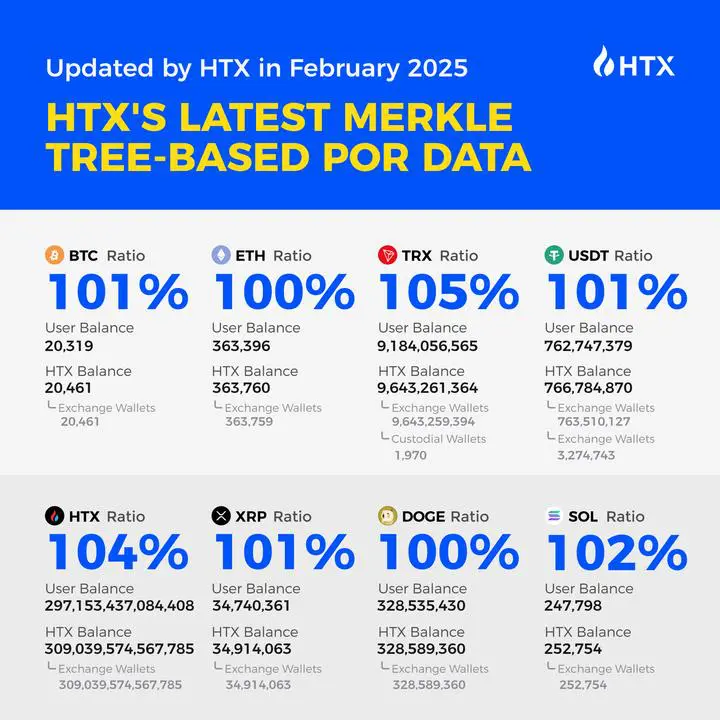 HTX has consistently demonstrated its commitment to transparency. The platform updated its Merkle Tree Proof of Reserves for February 2025, revealing that its reserve ratio for major assets (BTC 101%, ETH 100%, TRX 105%, USDT 101%, HTX 104%, XRP 101%, DOGE 100%, SOL 102%) consistently exceeds 100%. This marks the 28th consecutive month of public disclosure of reserve data, readily accessible for users on the “Assets – PoR Reports” page of the HTX official website.