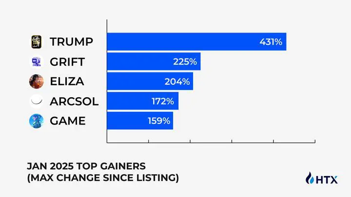 HTX listed 25 new assets in January, including notable AI and celebrity-themed tokens. AI projects like ELIZA (up 204%), ARCSOL (up 172%), GAME (up 159%), and GRIFT (up 225%) demonstrated strong performance. The platform was an early mover in listing the highly anticipated $TRUMP token, which surged by 431% post-launch. $MELANIA also experienced a 60% increase. HTX remains committed to offering users diverse investment opportunities and identifying promising early-stage projects.