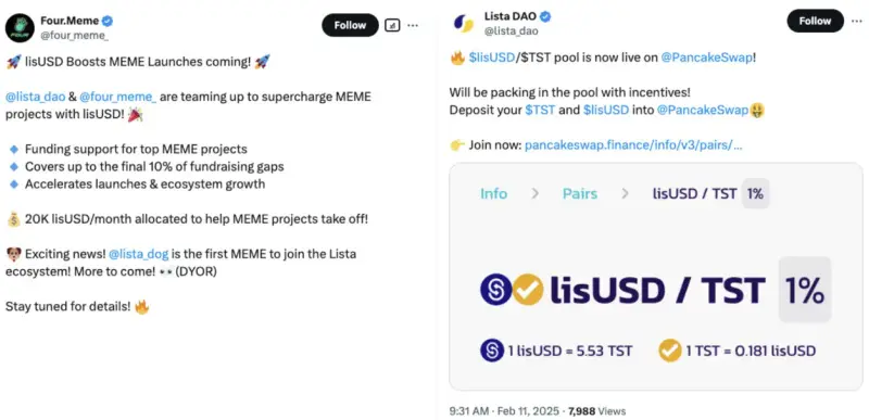 lisUSD & Four.Meme Partnership: Recognizing the growing demand for liquidity in the meme token space, Lista DAO has partnered with Four.Meme to support lisUSD as a funding and trading mechanism. Making lisUSD the first meme-friendly stable coin project on the BNB Chain. lisUSD has established liquidity pools with memes such as TST and CHEEMS in the BNB Chain ecosystem.