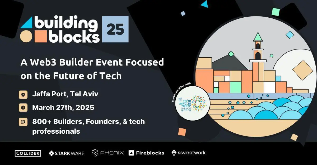 As part of ETHTLV Week (March 24-28), Building Blocks 25 will highlight the growth of Israel’s Web3 ecosystem while providing a forum for networking and discussion about key issues poised to reshape the industry. Supported by giants such as Starkware, Fireblocks, Collider, Fhenix, and SSV, the 2025 conference will be the largest to date.