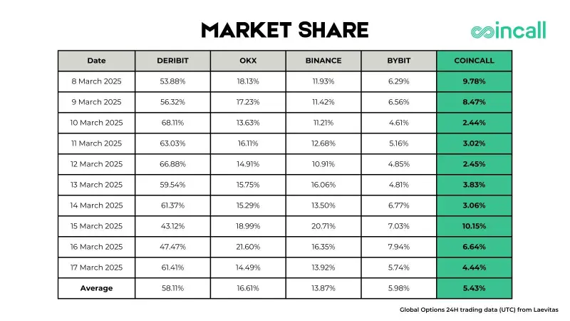 According to data from Laevitas, Coincall captured an average market share of 5.43% between March 8 and 17, 2025, with a notable peak at 10.15% on March 15. The exchange also saw strong volume days with 9.78% share on March 8 and 6.64% on March 16 — signaling rising momentum and growing competitiveness in the global crypto options landscape.