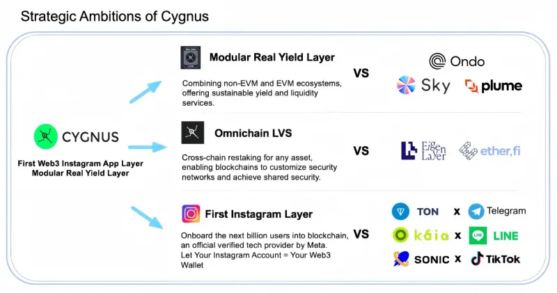 Cygnus is a blockchain protocol offering a dual-layer structure consisting of a Modular Real Yield Layer and a Web3 Instagram App Layer. Designed to lower entry barriers for users and developers, Cygnus supports omnichain interoperability, decentralized validation, and Web3-native engagement through social platforms. With a focus on real yield sustainability and scalable user onboarding, Cygnus aims to enable the next wave of Web2-to-Web3 transition.
