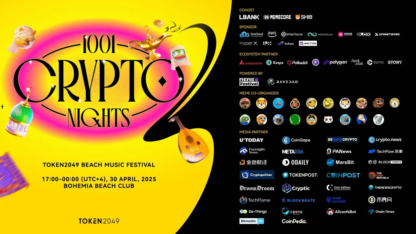 “1001 Crypto Nights” is a global top-tier Web3 festival presented by LBank on April 30, aimed at building a super hub for meme culture and the crypto community. As the most anticipated side event during TOKEN2049 Dubai, “1001 Crypto Nights” is jointly created by LBank, Memecore, and Shiba Inu. It will grandly debut at the iconic luxury Bohemia Beach Club. This epic event seamlessly blends the spirit of Web3, electronic music euphoria, and Arabic aesthetics, bringing together global crypto elites, representatives from over 20 top meme communities, and pioneers in the financial field, creating an immersive experience that unites “Crypto · Entertainment · Culture.”
