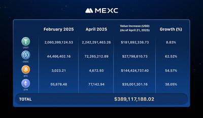 A comparison between February and April 2025 reveals a notable surge in MEXC’s asset holdings, with total on-chain reserves increasing by approximately $389.1 million: