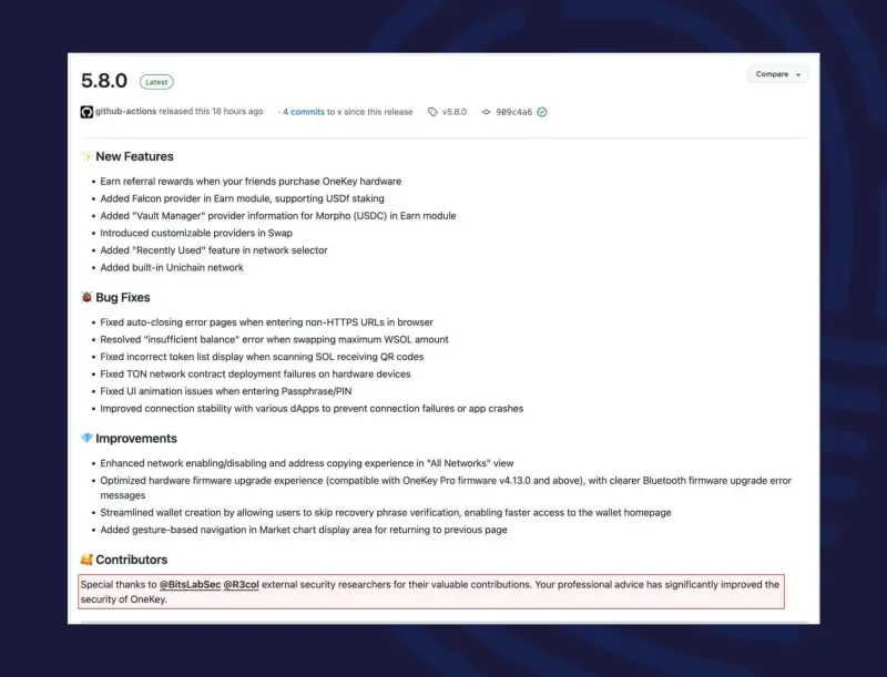 The OneKey update log states: “Special thanks to external security researchers @BitsLabSec and @R3col for their invaluable contributions. Their expertise has significantly strengthened OneKey’s security posture.”