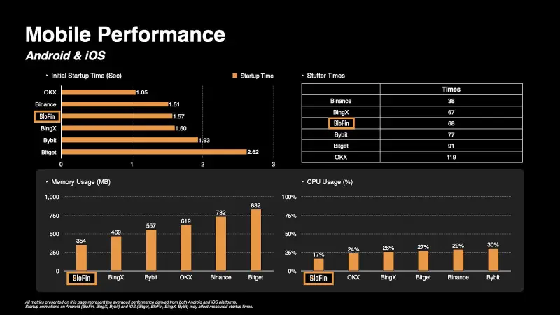In addition, it demonstrates industry-leading memory efficiency, using only 354 MB compared to Binance (732 MB) and Bitget (832 MB), and achieves the lowest CPU usage at just 17%, which minimizes device strain and maximizes battery life during trading.