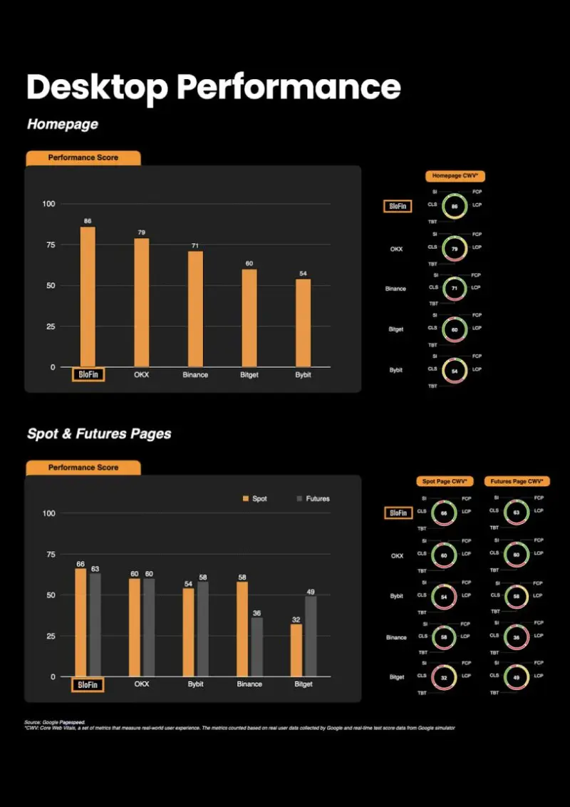 BloFin Outperforms Top Exchanges with Best-in-Class Homepage, Spot, and Futures Trading Performance. According to real-user data and Google PageSpeed testing, BloFin’s homepage scored 86, outperforming OKX (79), Binance (71), Bitget (60), and Bybit (54), which deliver faster loading, smoother interaction, and a superior first impression for users.