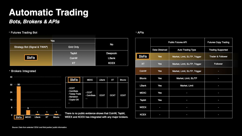 Additionally, BloFin leads the industry with 30 broker integrations, far surpassing other exchanges. Major partners include CCXT, CoinStats, Tuleep Trade, Alertatron, and Crypto OS, giving users unparalleled access to external trading tools and ecosystems. BloFin stands out with clear, verifiable partnerships with top broker platforms.