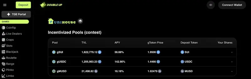 DoubleUp is a blockchain-based casino platform operating on the Sui network, designed to integrate gaming with decentralized finance (DeFi) elements. It offers users a combination of real-time betting features and on-chain transparency, aiming to provide a novel framework for digital gambling within the Web3 space. The platform incorporates what it terms a “GambleFi” model, positioning itself at the intersection of gaming and decentralized finance by introducing mechanisms for both active participation and passive engagement through its DeFi infrastructure.