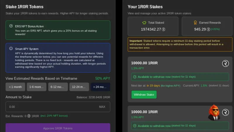 Beyond aesthetic or collectible use, ERS NFTs serve functional roles within the platform. When locked, they deliver increasing monthly payouts and can boost staking rewards when held alongside $1R0R in the same wallet. Bonus incentives are also available for verified users.