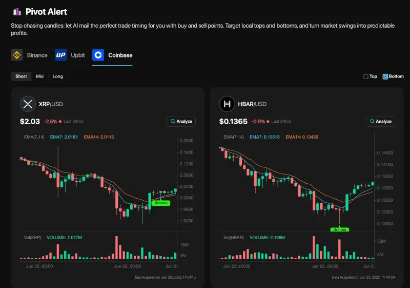Pivot Alert introduces a dynamic tool called Top/Bottom Caller, designed for traders looking to capitalize on critical market turning points. This feature identifies when a crypto token is approaching a local market top or bottom, giving users the edge to time their entries and exits more effectively and potentially capture premium trades during reversals.