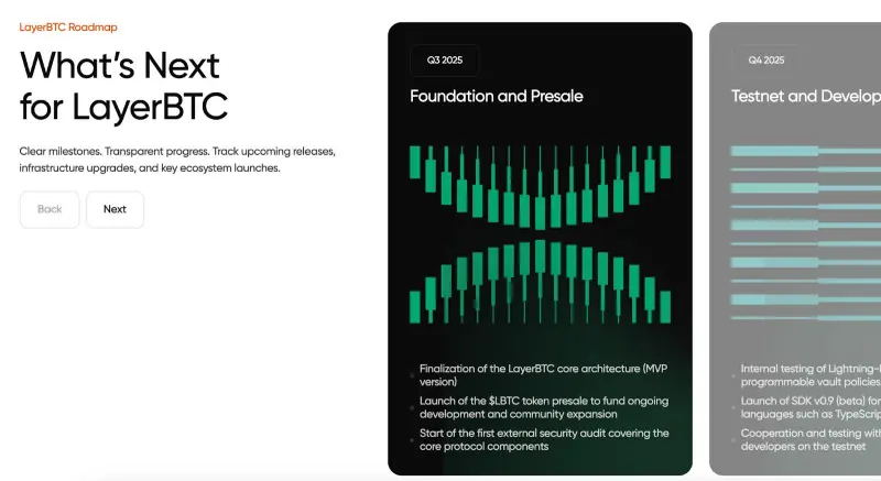 The following quarter will see the launch of a developer testnet and SDKs in multiple programming languages, enabling integration with wallets and apps. By Q1 2026, LayerBTC plans to activate mainnet smart vaults, open its developer grant program, and release SDK v1.0 for production-ready applications.