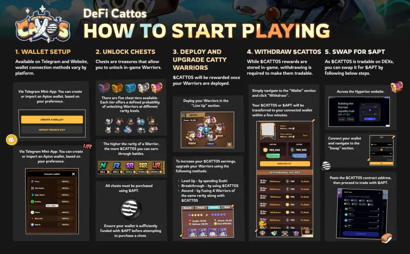 DeFi Cattos, a high-performance GameFi frontier – delivering a fully on-chain, gasless RPG experience instantly playable via browser or Telegram. Built on Aptos’ parallel execution and Move VM, DeFi Cattos offers frictionless Web3 gameplay with zero downloads or wallet setup required.