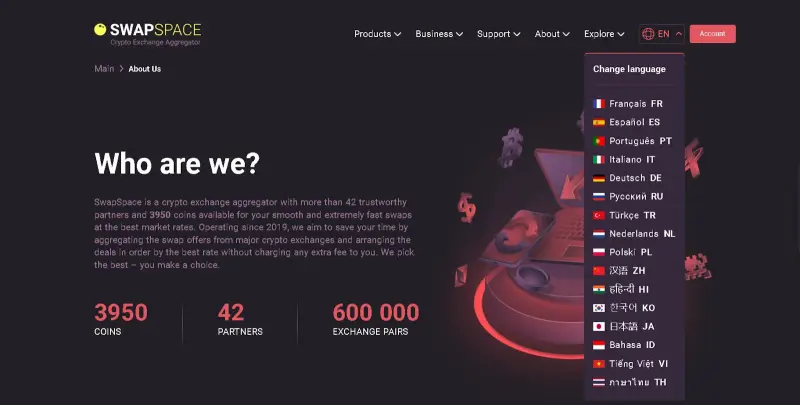 SwapSpace is a crypto exchange aggregator with more than 42 trustworthy partners and 3950 coins available for smooth and extremely fast swaps at the best market rates. Operating since 2019, we aim to save traders’ time by aggregating the swap offers from major crypto exchanges and arranging the deals in order by the best rate without charging any extra fee.