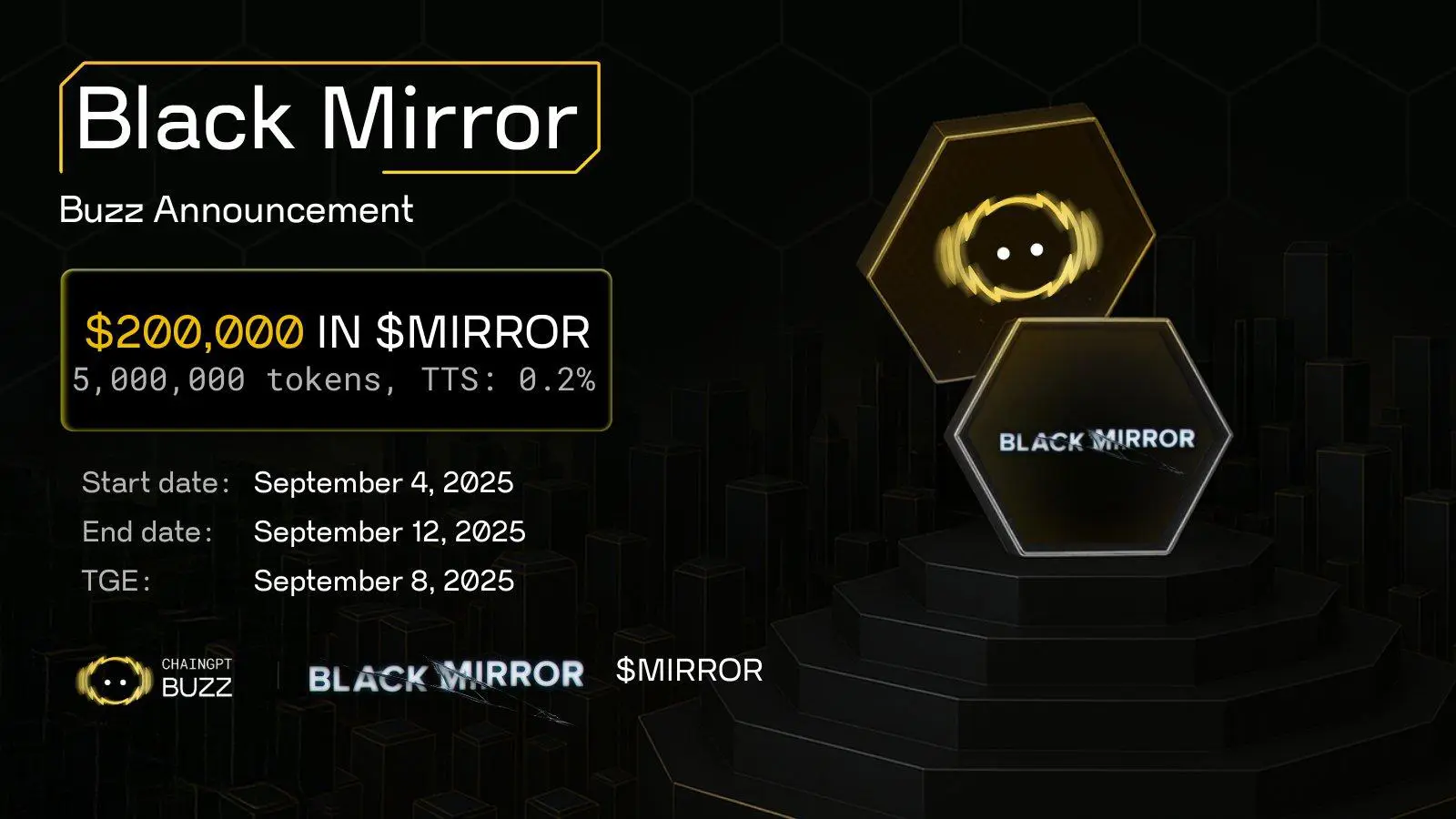 ChainGPT Pad is excited to announce the launch of the Black Mirror ($MIRROR) BuzzDrop, giving fans and community members the opportunity to earn a portion of $200,000 worth of $MIRROR tokens by buzzing, engaging, and rising up the leaderboard.
