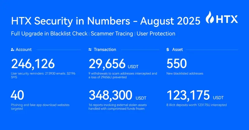 HTX strengthened its security and user asset protection in August. The exchange issued 246,126 security alerts, blocked 40 phishing and fake sites, intercepted 9 withdrawals to scam addresses (saving users 29,656 USDT), froze 348,300 USDT linked to 16 external theft cases, and added 550 new addresses to its blacklist. It also prevented a loss of 123,175 USDT in 8 blacklisted deposits.