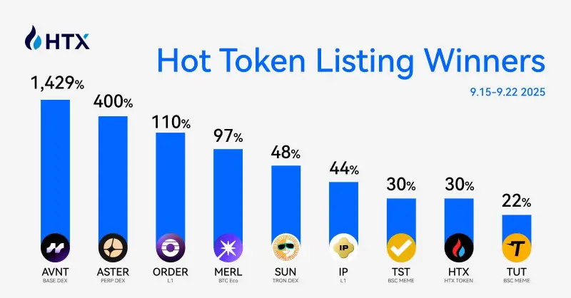 Over the past week (September 15 to 22), while the global crypto market continued to fluctuate, new listings on HTX surged with strong momentum across multiple sectors. On-chain futures exchanges stole the spotlight, with AVNT and ASTER spearheading the rally. Meanwhile, the BTC ecosystem, L1/L2 blockchains, and meme coins also showed impressive performance, fueling a rise in trading activity.