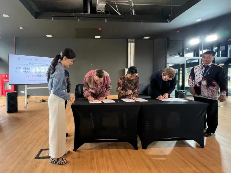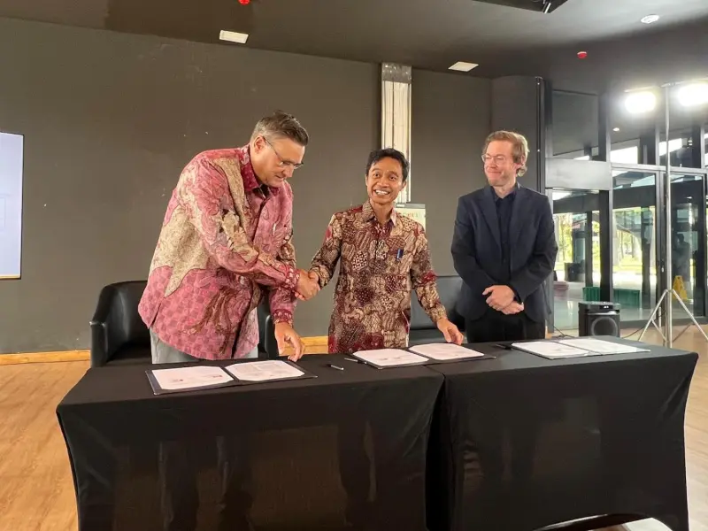 Photos: Scott Dykstra (right) signs the partnership into effect with representatives from Indomobil (left) and UGM (center).