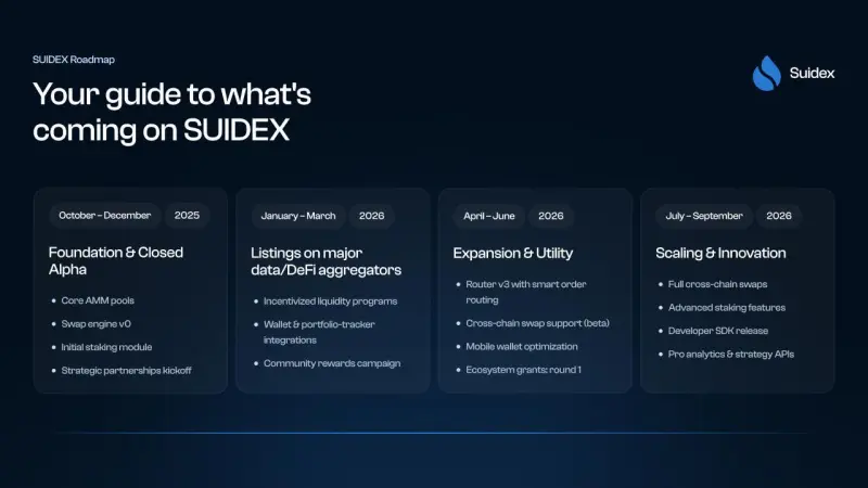 The Q4 2025 roadmap sets the foundation for SuiDEX’s ecosystem role, with milestones including the mainnet launch, token swap functionality, and the initial staking module. SuiDEX will be an active component of Sui’s DeFi environment from the start thanks to these features.