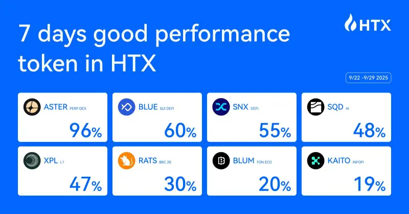 - ASTER (+96%|Perp DEX): Offering both perpetuals and spot trading on-chain, Aster has quickly captured traders’ attention with features like MEV-free execution and one-click orders. Since its launch, ASTER has recorded a 96% price increase over the past week, making it the top-performing new listing on HTX during that period, based on available exchange data.