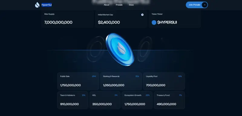 HYPESUI is a utility token designed to support the platform’s liquidity infrastructure, governance, and long-term sustainability. The SuiDEX total supply is 7 billion tokens with 25% allocation for the $HYPESUI presale.