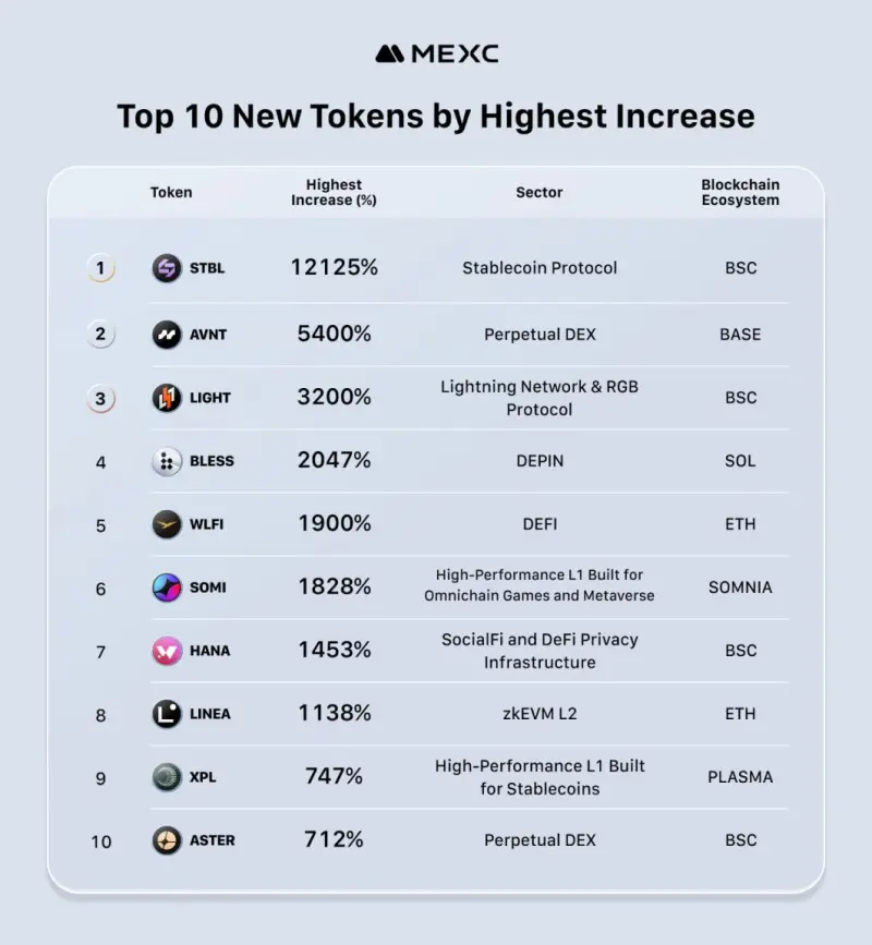 BSC emerged as September’s leading blockchain ecosystem, with four tokens (STBL, LIGHT, HANA, ASTER) achieving an average gain of 4,373%. Ethereum-based projects followed with a 1,519% average increase, while Base, Solana, and emerging ecosystems such as SOMNIA and PLASMA also delivered quadruple- and triple-digit returns.