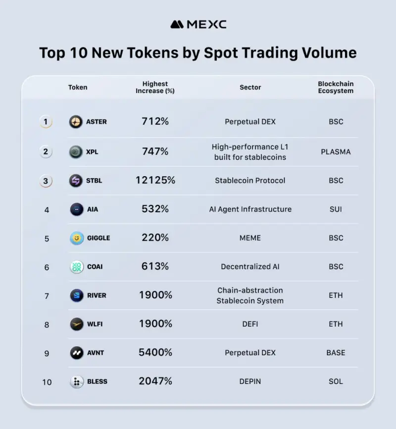 Perpetual DEX, AI, and stablecoin-linked projects led MEXC’s top-performing tokens. The top 10 tokens by spot trading volume delivered an average gain of +2,620%, up 47% from Q2. Flagship Perpetual DEX tokens such as AVNT (+5,400%) and ASTER (+712%) set the tone for the month, supported by Base and BSC chain ecosystems.