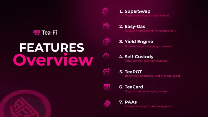 Tea-Fi is a DeFi SuperApp that merges the usability of Web2 with the transparency of Web3. Through innovations like account abstraction, multi-chain compatibility, and its protocol-owned liquidity vault (TeaPOT), Tea-Fi enables users to experience DeFi as it was meant to be: simple, sustainable, and rewarding.