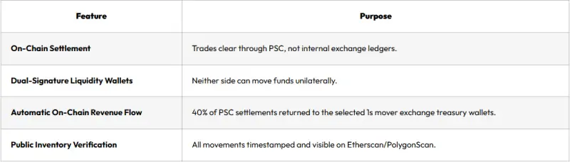 Rather than moving tokens into custodial accounts where liquidity can be altered without visibility, MAPU integrates exchanges through the PSC Liquidity Engine, which enforces: